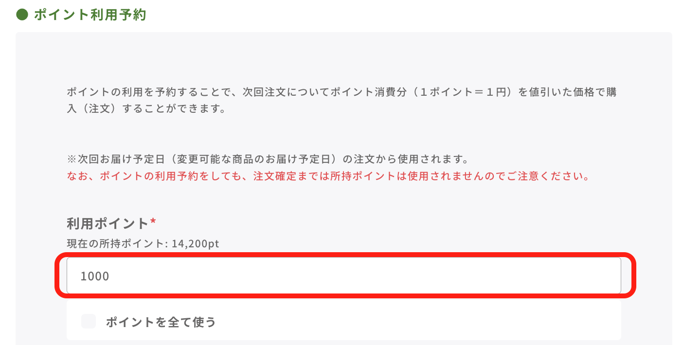 ※1回につき利用できるポイントの上限は2,000ポイントとなります。※最新の「現在保有ポイント」をご確認いただいたうえで、ポイントの有効期限内にお届け日を設定してください。