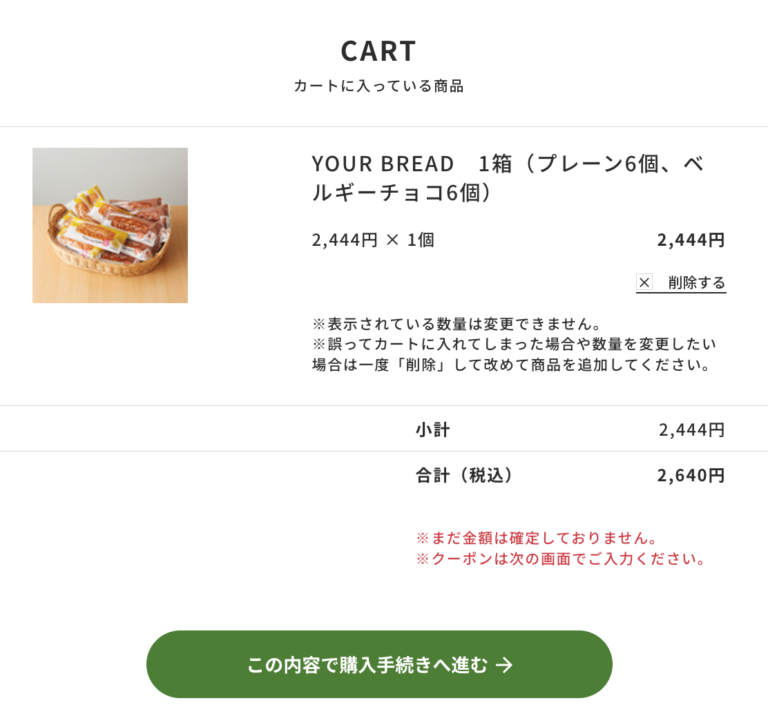 1.購入したい商品をカートに入れ、マイページにログインする2.カートページの「この内容で購入手続きへ進む」をクリックする