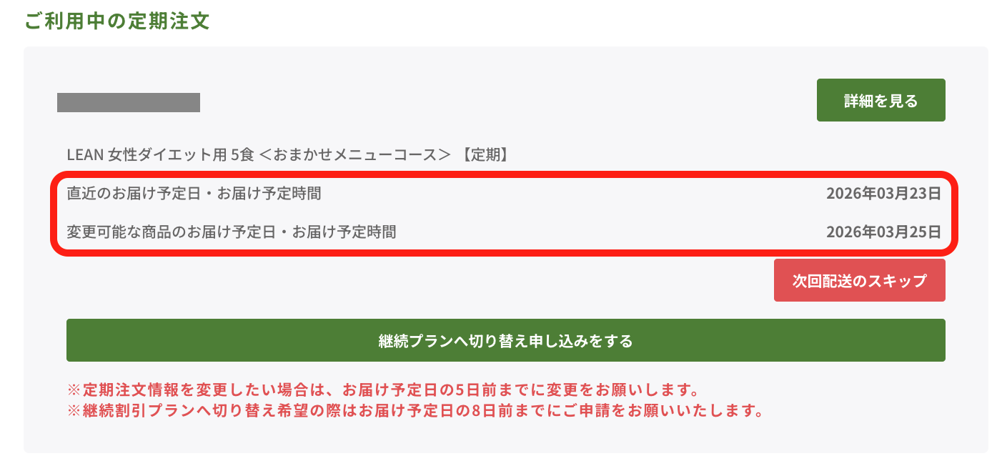 1.マイページにログイン後、トップにある<ご利用中の定期注文>より、ポイントを使用したい定期プランの「詳細を見る」ボタンをクリックする
