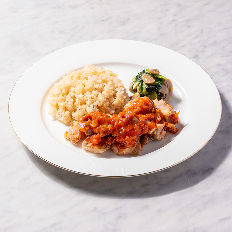 皮なし鶏モモ肉(ブラジル産)、チンゲン菜、玄米(国産)、マッシュルーム水煮、トマトケチャップ、玉ねぎ、トマトペースト、清酒風調味料、オリーブ油、砂糖、バター、みりん、醤油、食塩、にんにく、ウスターソース、こしょう/加工デンプン、pH調整剤、酸化防止剤(V.C)、(一部に小麦・乳成分・大豆・鶏肉・りんごを含む)