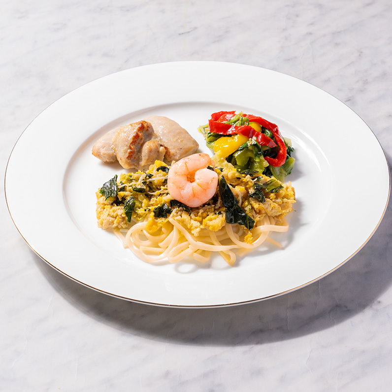 本場タイの屋台の味を思わせる「パッタイ」を主役に据えたエスニックセット。鶏むね肉や海老、もちもちの米粉麺をナンプラーがきいた特製ソースで仕上げました。副菜のタイ風グリルチキン「ガイヤーン」と、さっぱり感がうれしい「青菜とピーマンのエスニックナムル」とぜひ一緒にお楽しみください。